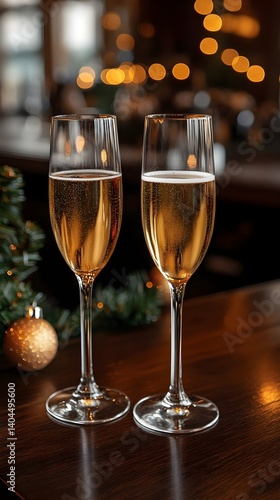 Two Glasses of Champagne on a Wooden Table with Festive Bokeh Lights