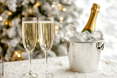 Two glasses of champagne with a bottle in an ice bucket and Christmas decorations on a white background. A Christmas tree is in the background