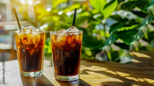 Two glasses of iced coffee sit elegantly on a wooden table, illuminated by warm sunlight filtering through vibrant leaves, evoking a refreshing summer feel in a cafe atmosphere