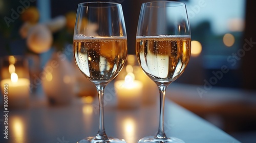 Two Glasses of Sparkling Wine Candles and Flowers