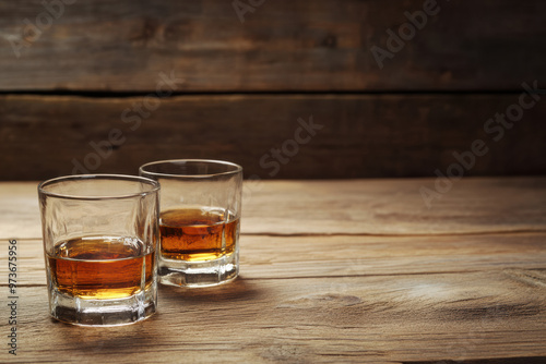 Two glasses of whiskey on a wooden surface with a rustic background. Perfect for themes of relaxation, celebration, and indulgence.