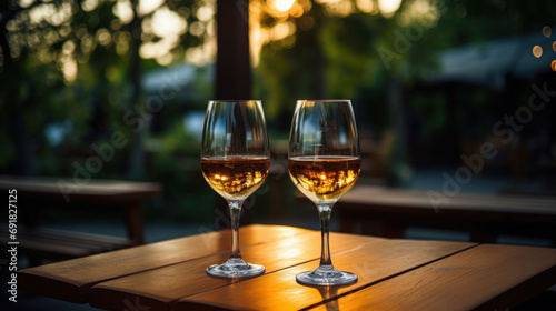 Two glasses of white wine on wooden table in outdoor restaurant. Selective focus.