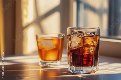 Two glasses with ice and dark liquid on a surface