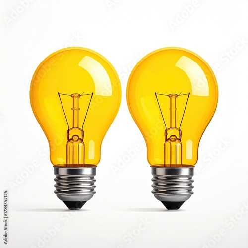 Two glowing bulbs, yellow, bright, on white background