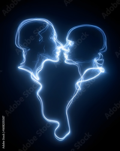 Two glowing figures made from a single line of light are about to kiss, forming a heart shape. A concept for love, romance, and connection.