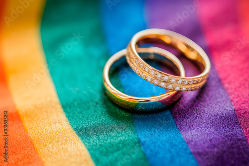 Two gold wedding rings on rainbow lgbt flag. Homosexual marriage. Lgbt rights and law.