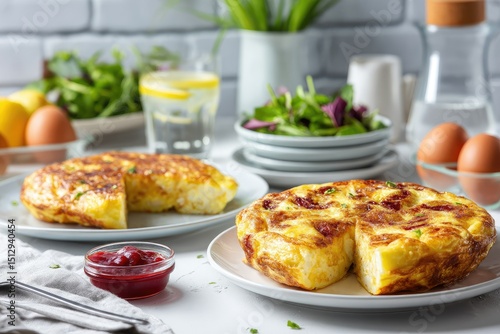 Two golden-brown Spanish tortillas, one sliced, served on white plates with a side salad, eggs, and a small bowl of red sauce on a bright counter