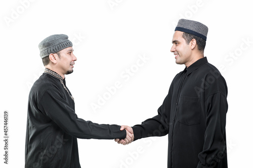 Two good-looking Asian Muslim men standing, hello, greeting with a smiley face, on white background.