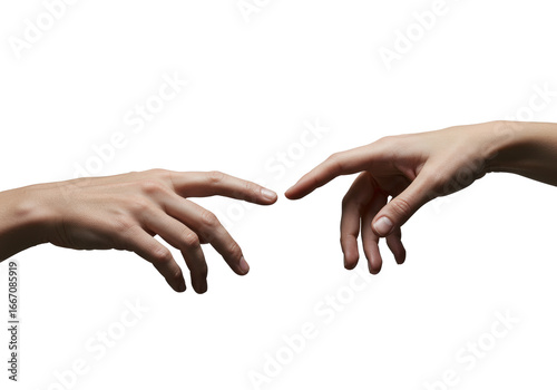 Two graceful human hands with subtle fine lines, clean nails, fingertips poised millimeters apart on a seamless transparent studio background with soft diffused light, concept of delicate human