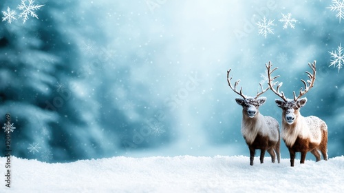 Two graceful reindeers traverse a snowy landscape, surrounded by a mesmerizing winter forest, evoking a sense of peace and awe in the tranquil beauty of nature.