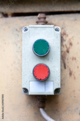 Two green and red buttons remote, industrial machinery operation pad frontal shot, closeup. On and off heavy duty electric circuit simple switch concept, factory area detail macro