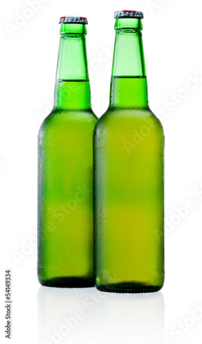 Two green bottles of beer with condensation isolated on white ba