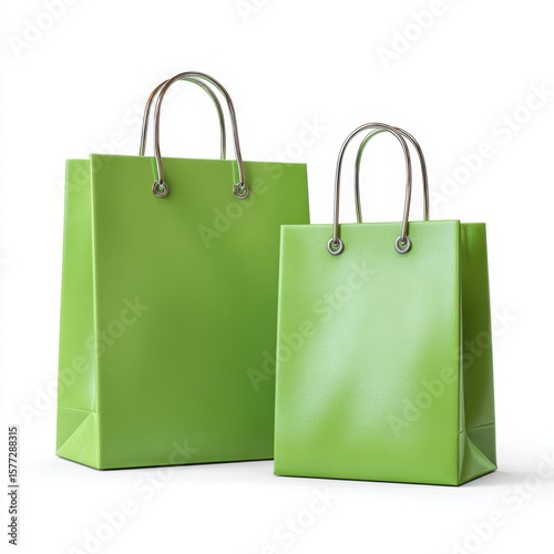 Two green shopping bags of different sizes with metallic handles isolated on white background