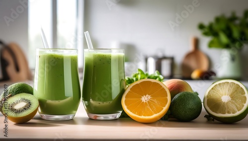 Two green smoothies, glasses, fruits, kitchen background, healthy, fresh, light setting.