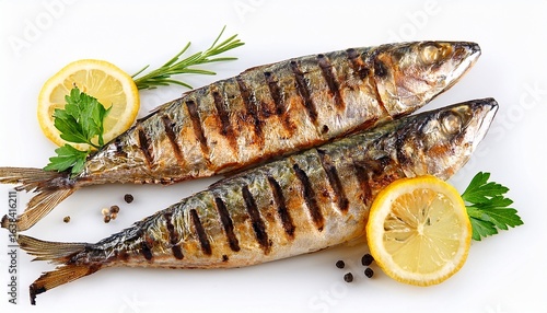 two grilled sardines with lemon and herbs on white background