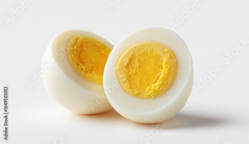 Two halved hard-boiled eggs, yolk visible, against a white background