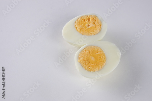 two halves of a boiled egg on white background