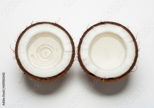 Two halves of a fresh coconut on a white background