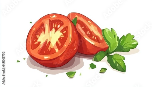 Two halves of a vibrant red tomato, with fresh parsley leaves scattered around