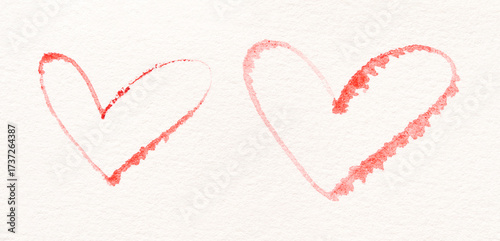 Two hand-drawn red hearts on white paper texture background symbolizing love and affection.