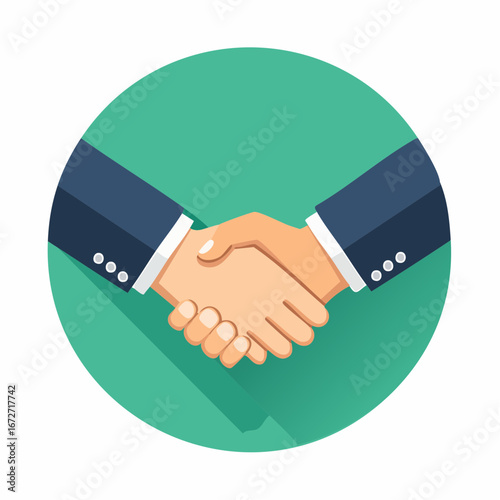 Two hands clasped in a firm handshake, symbolizing agreement and partnership, set against a green circle.