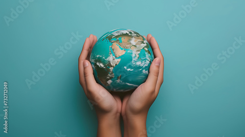 Two hands cradle a miniature Earth against a vivid blue background, symbolizing care and responsibility for our planet