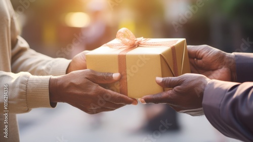 Two hands exchange a thoughtfully wrapped gift box with a ribbon, symbolizing generosity, celebration, and the joy of giving.