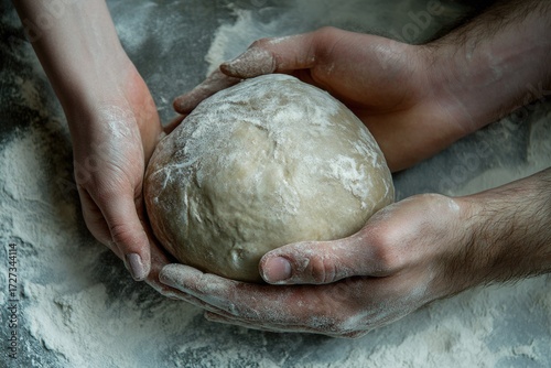 Two hands gently cradle a ball of raw dough, covered in flour, symbolizing baking and creation.