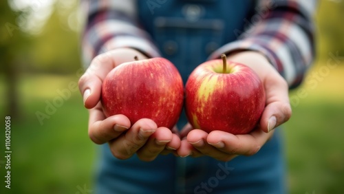 Two hands grasp ripe red apples with yellow streaks, set against a vibrant green orchard. The harvest season brings warmth and abundance to the scene