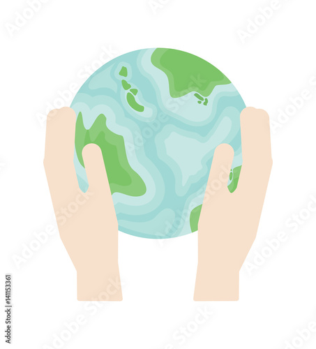 Two hands hold a planet earth in flat style. Symbol of respect for environment.