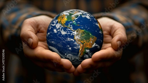 Two hands holding a realistic earth globe, with South America visible. AI generative. .