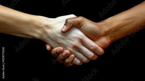 Two hands of different skin colors shake, symbolizing unity and collaboration.
