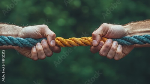 Two hands pulling a thick rope, showcasing strength, teamwork, and competition.