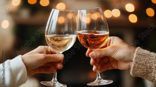 Two hands raise wine glasses in a joyful toast against a backdrop of twinkling lights, symbolizing celebration, togetherness, and special moments shared with loved ones.