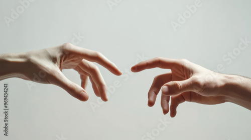 Two Hands Reaching Out To Each Other Against A White Background. Concept Of Connection, Hope, Or Love.