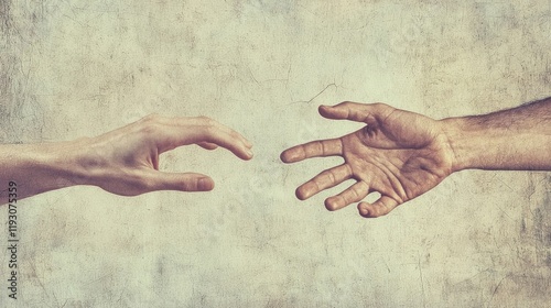 Two hands reaching out towards each other, illuminated by soft light, symbolizing connection and longing. Generative by AI.