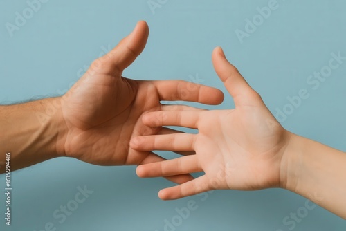 Two hands reaching out towards each other on a smooth blue background, symbolizing connection and communication