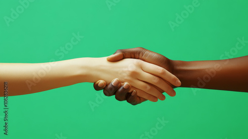 Two hands shake against a bright green background. Concept of unity and agreement.