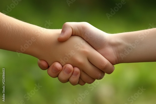 Two hands shaking in a lush green outdoor setting