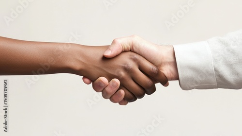 Two hands shaking, one black and one white, against a white background
