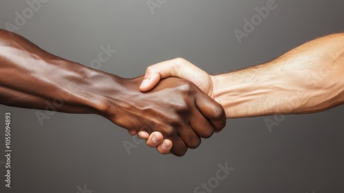 Two hands shaking, symbolizing unity and cooperation, with a neutral grey background.