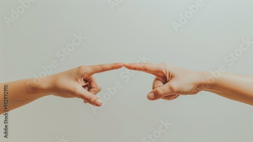 Two hands with pointing fingers intersecting, symbolizing collaboration and teamwork in reaching common goals against a neutral background ,
