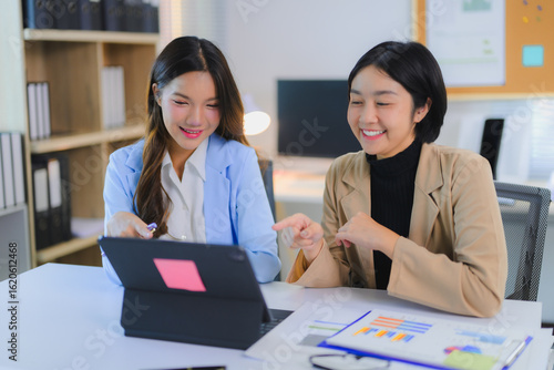 Two happy asian businesswomen discussing and working together using tablet in office