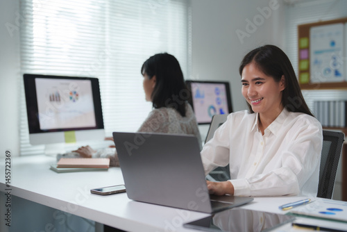 Two happy asian businesswomen working with laptop computer and desktop computer showing financial charts in modern office, business financial technology concept