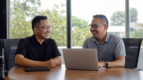 Two happy busy asian mature sales professional business people company work team working together on laptop computer or manager consulting client at office corporate meeting.
