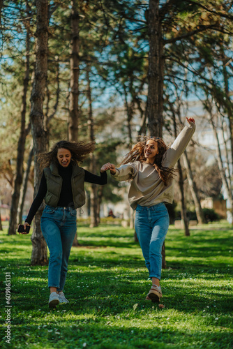 Two happy, smiley, gorgeous girls, dancing while walking in the park