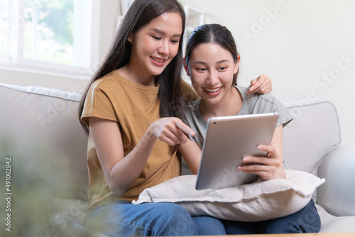 two happy women lesbian couple watching series on the internet via touchpad relax.