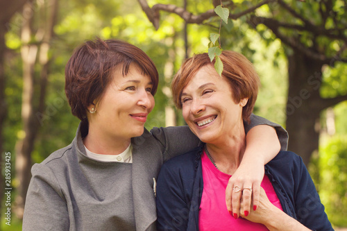 Two happy women walking in summer park, portrait