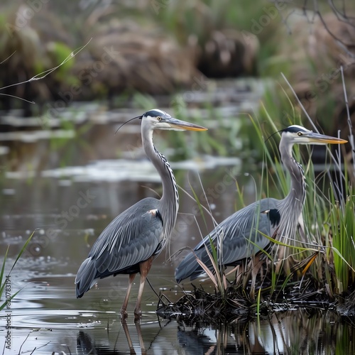 Two herons standing in a wetland area with tall grass, reflecting in the calm water, showcasing beautiful wildlife scenery.