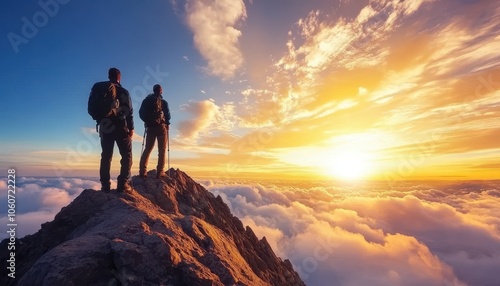 Two hikers celebrate team success at mountain peak during sunset